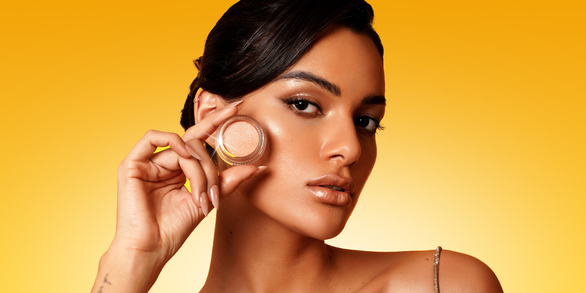 Satin-finish eyeshadow in a metallic peachy nude with golden shimmer. Use alone as eyeshadow for highlighted areas or layered over other Cream Color for a pop.
