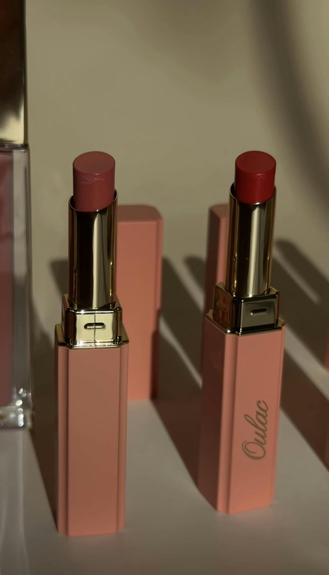 Oulac Moisture Shine Lipstick features a melting balm-like texture that hydrates without feeling heavy, offering a comfortable, glossy finish that doesn't bleed. It provides long-lasting moisture and is designed for easy portability, making it ideal for on-the-go use.